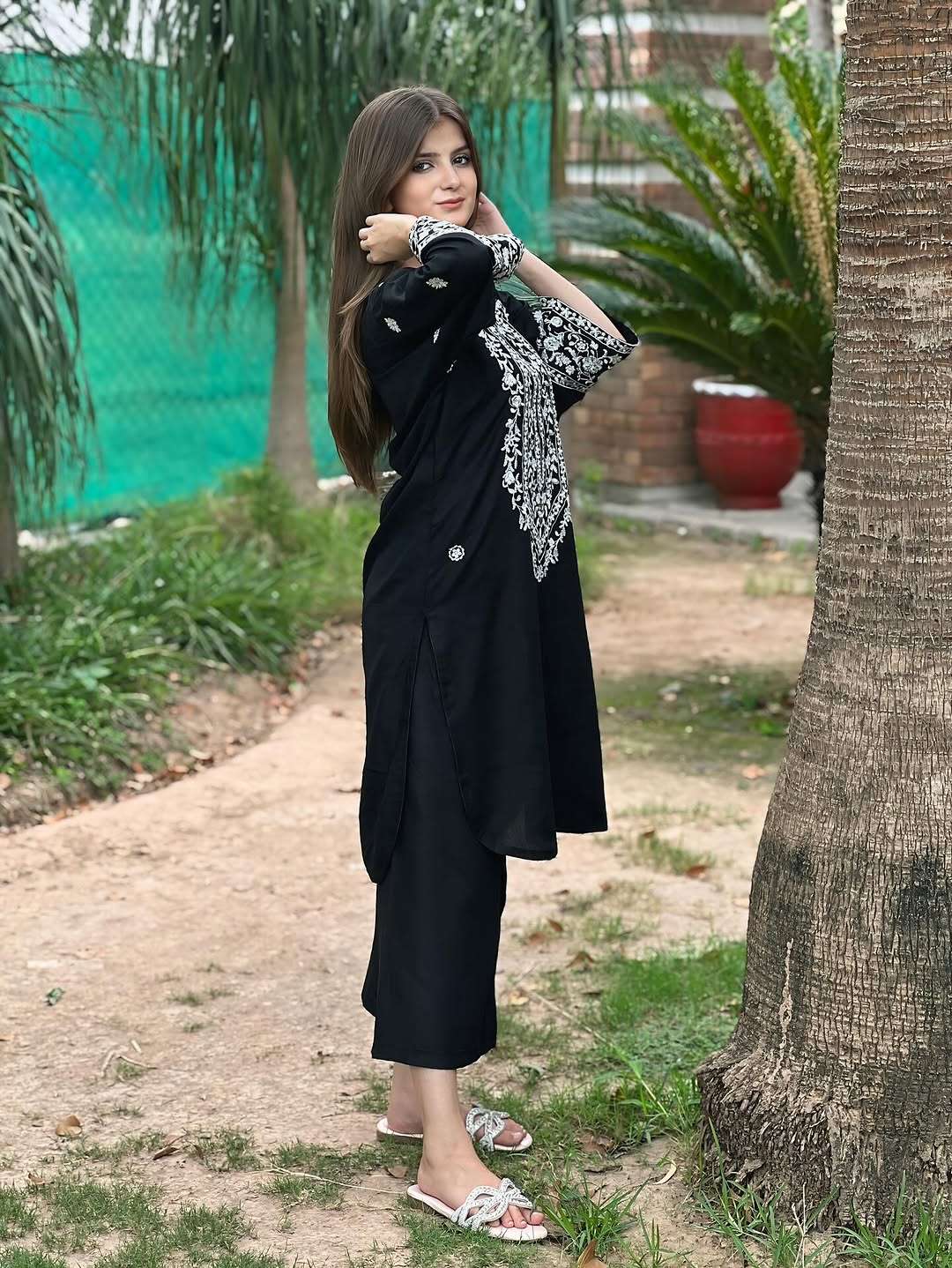 *LONG NECK Embroidery* Round Shirt With *PLAZO*